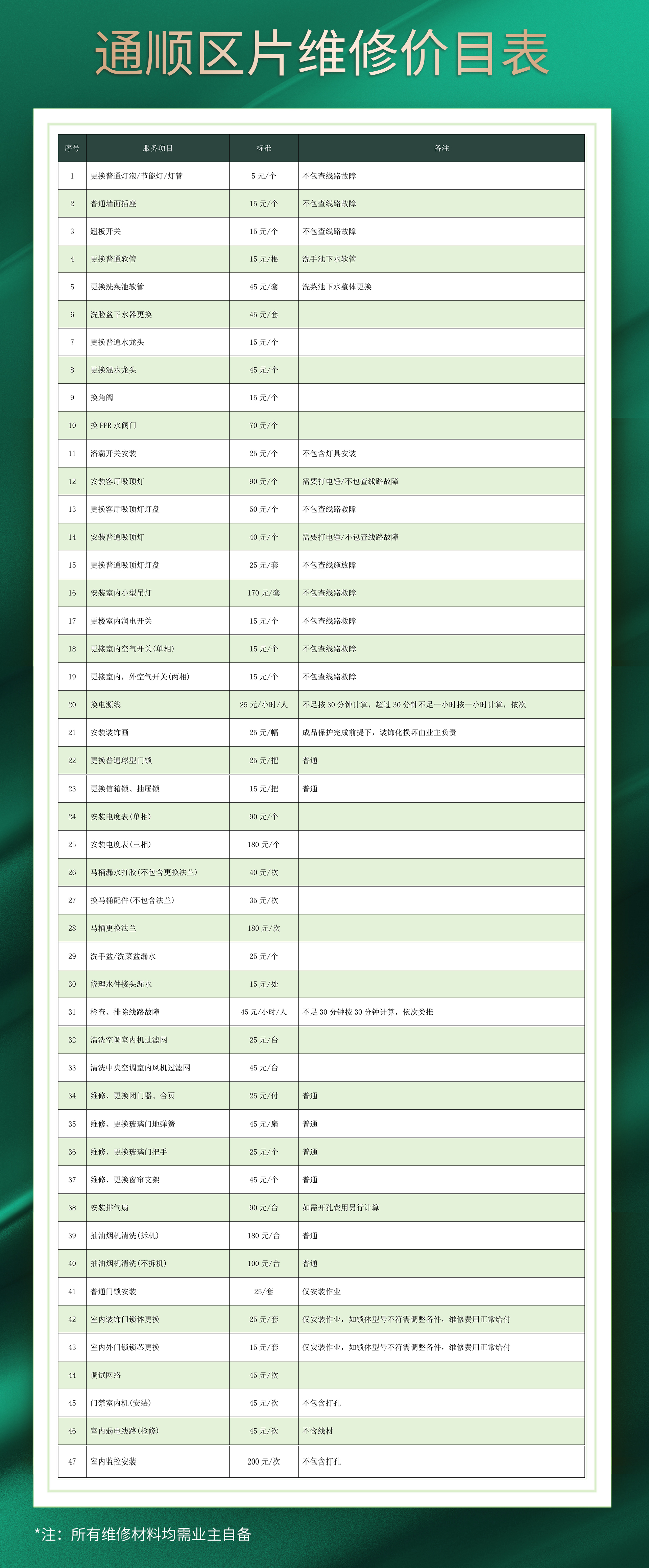| 15 | 更换普通吸顶灯灯盘 | 25元/套 | 材料业主自备 | 不包含线路故障 |