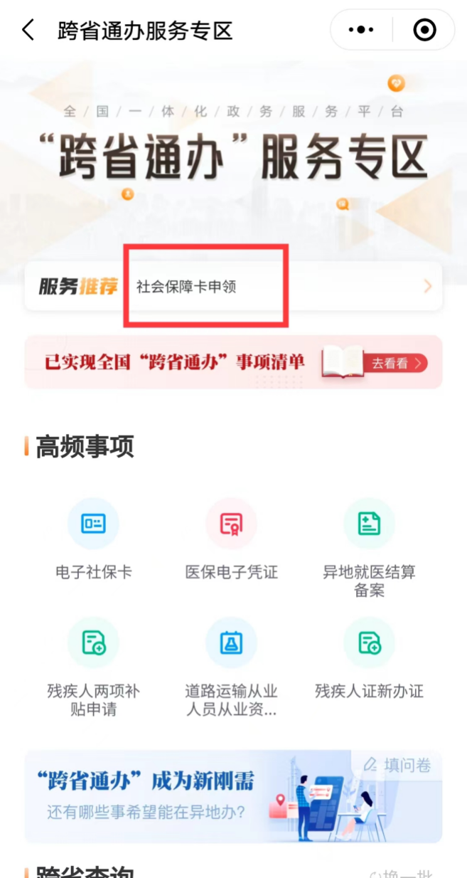 微信搜索国家政务服务平台微信小程序,进入跨省通办服务专区,即可办理社保卡相关业务。