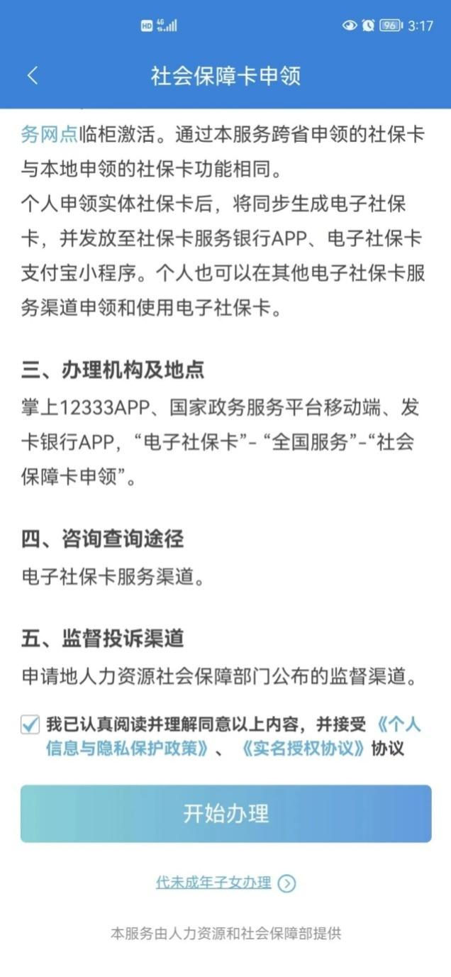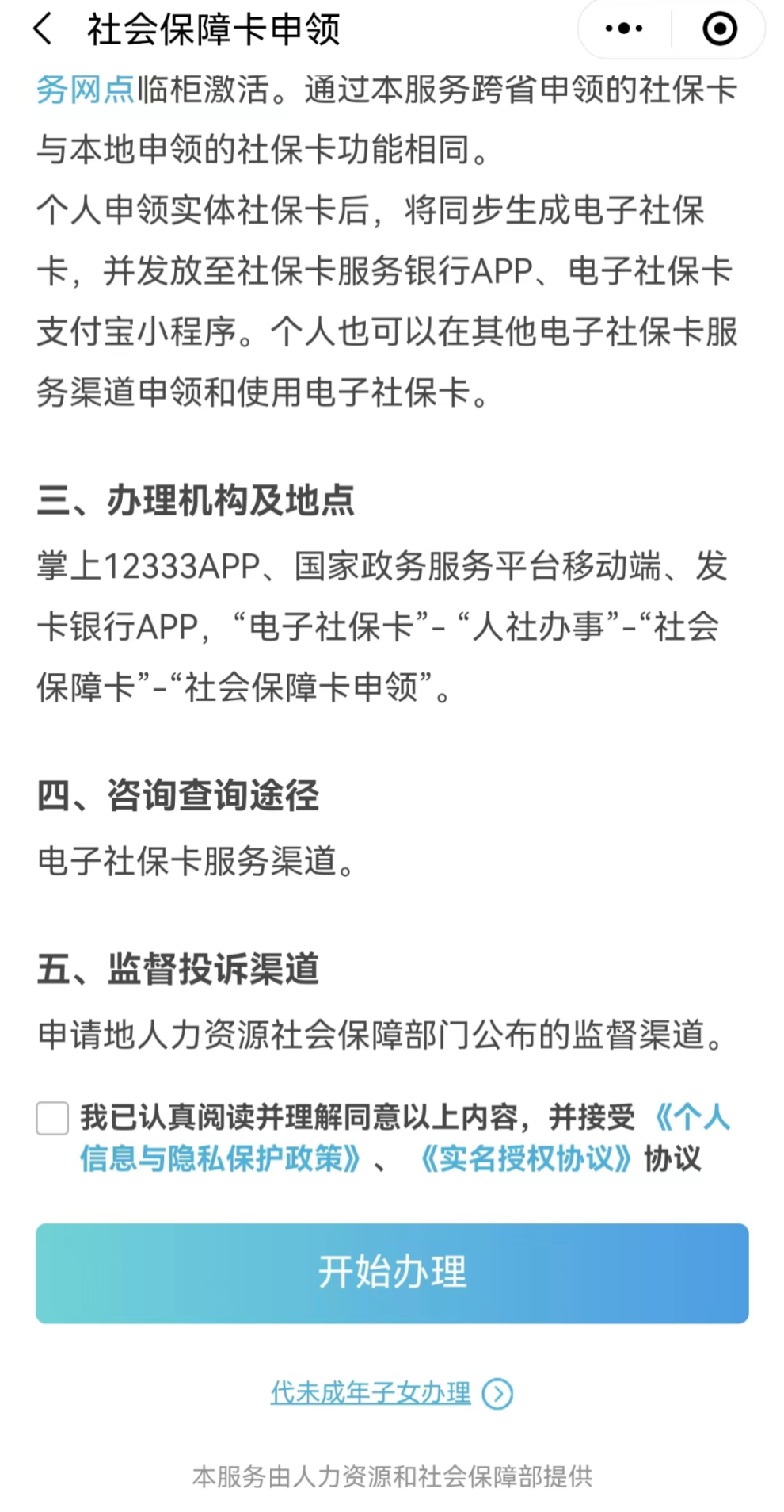 二、点击下方“代未成年子女办理”,阅读“办事指南”并勾选我已认真阅读并理解同意以上内容。并接受《个人信息与隐私保护政策》、《实名授权协议》协议。