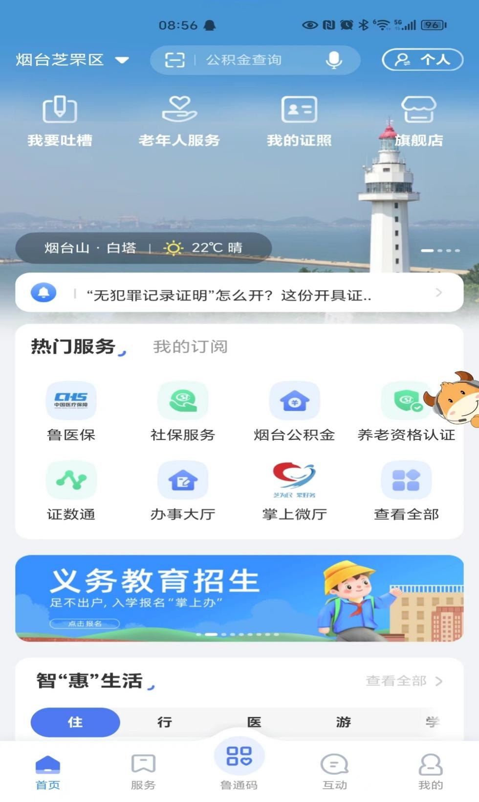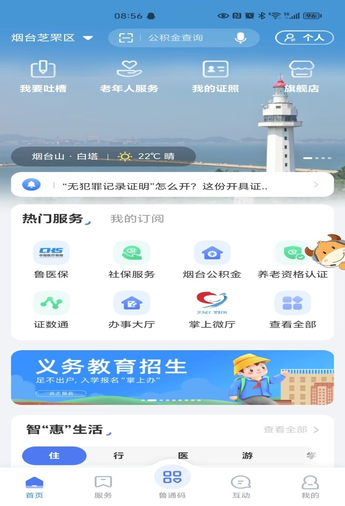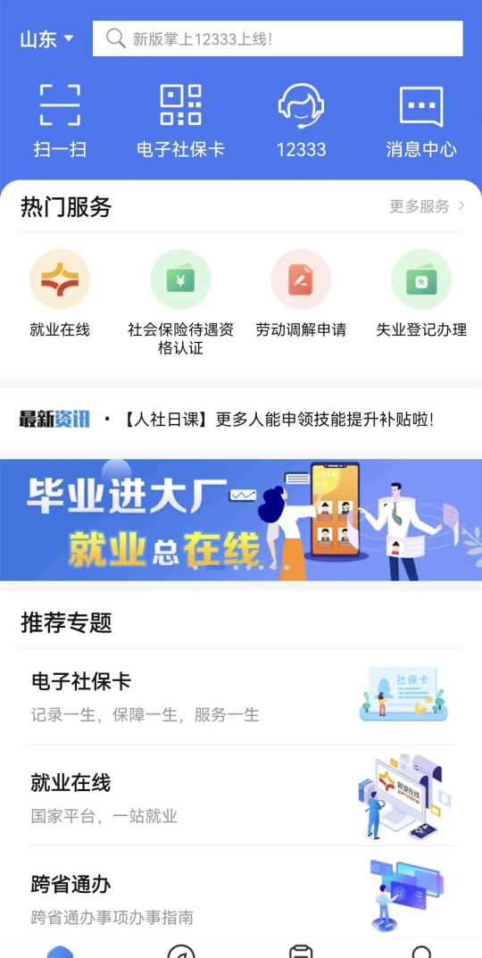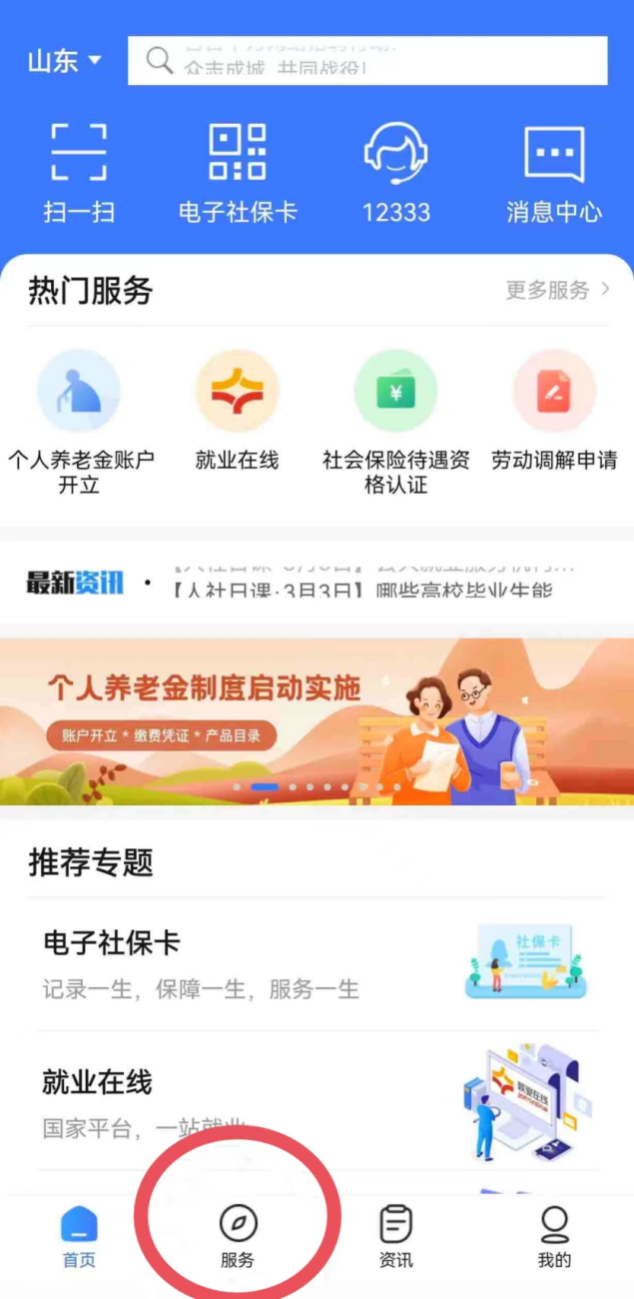 您可以下载爱山东APP,实名注册账号后,找到首页-热门服务-社保服务,如下图: