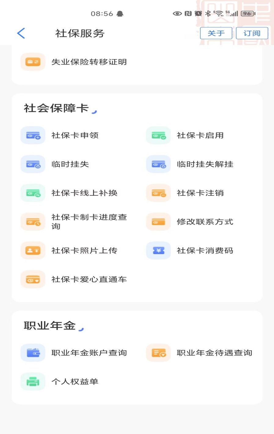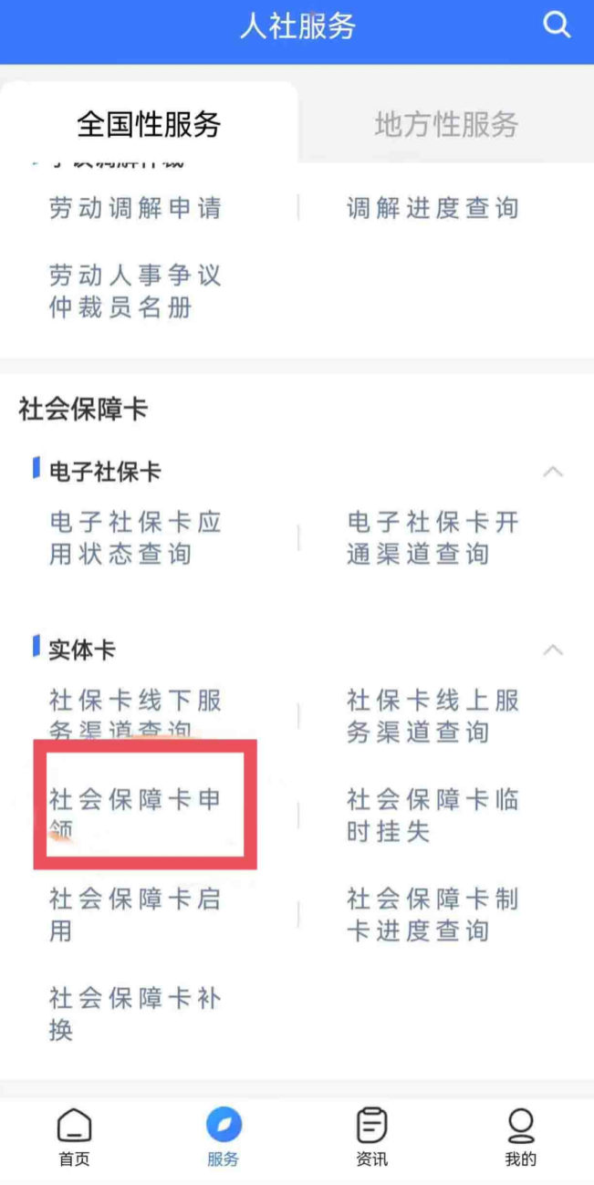 点进去下拉找到社会保障卡,即可办理社保卡相关业务,如下图: