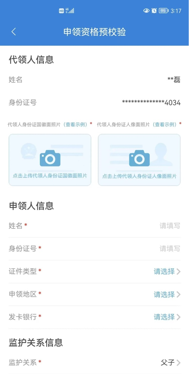 三、进入申领资格预校验并按照提示将代领人及申领人信息填写完整。