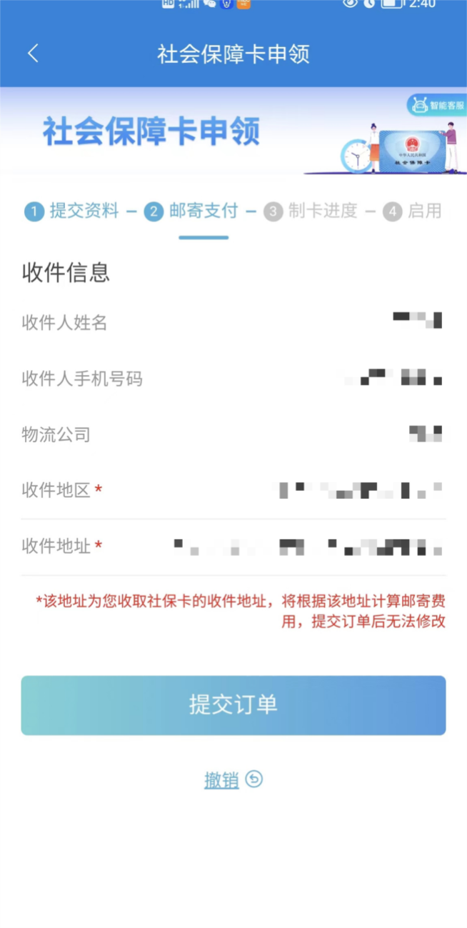 四、进入社会保障卡申领界面上传申领人社保卡相片,勾选选项后提交申请,根据系统提示继续操作,填写邮寄信息点击提交订单。(无需担心,不扣费!)