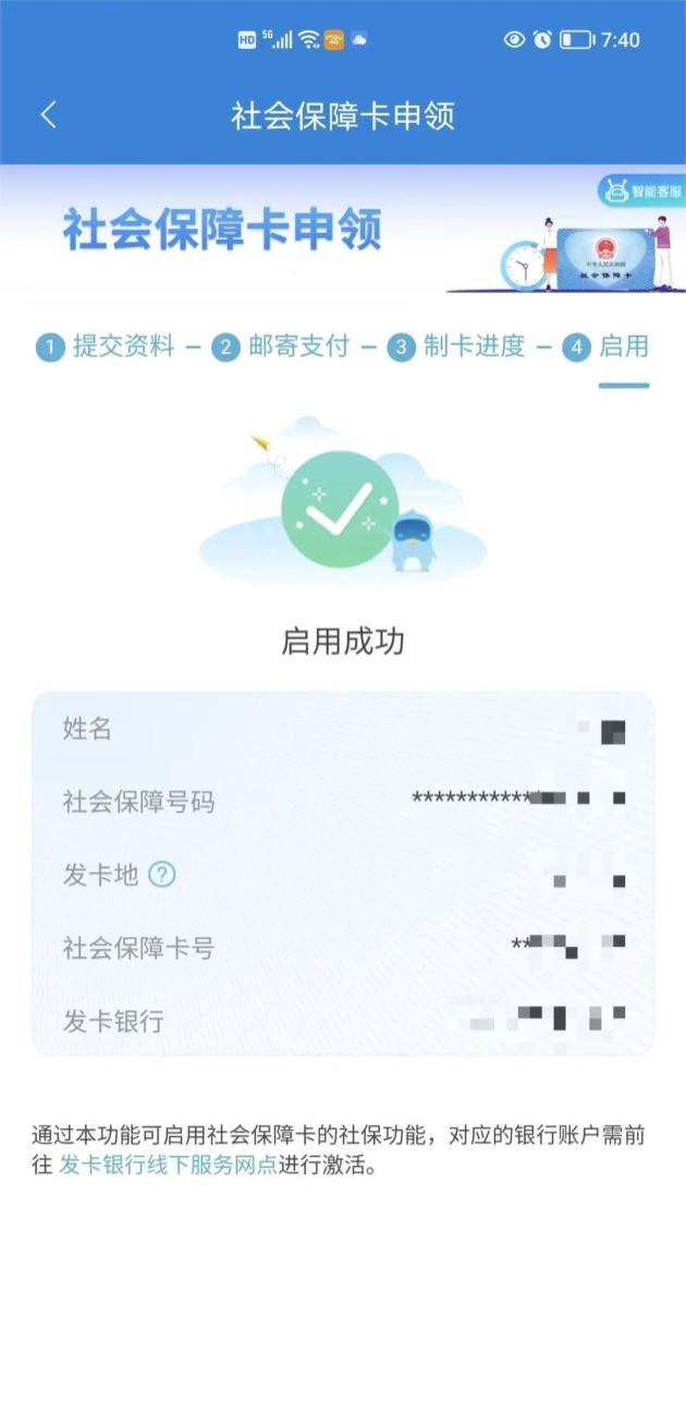 五、收到邮寄的社会保障卡后,进入”掌上12333"在社会保障卡申领界面点击"已领卡"进入启用模块,通过代领人人脸识别,完成社保卡启用。社保卡金融账户的激活需要监护人携带身份证、户口本、出生证明至社保卡所属银行进行激活,若监护人跟孩子不在一个户口本等特殊情况激活需咨询银行,按照银行规定携带相关证件。