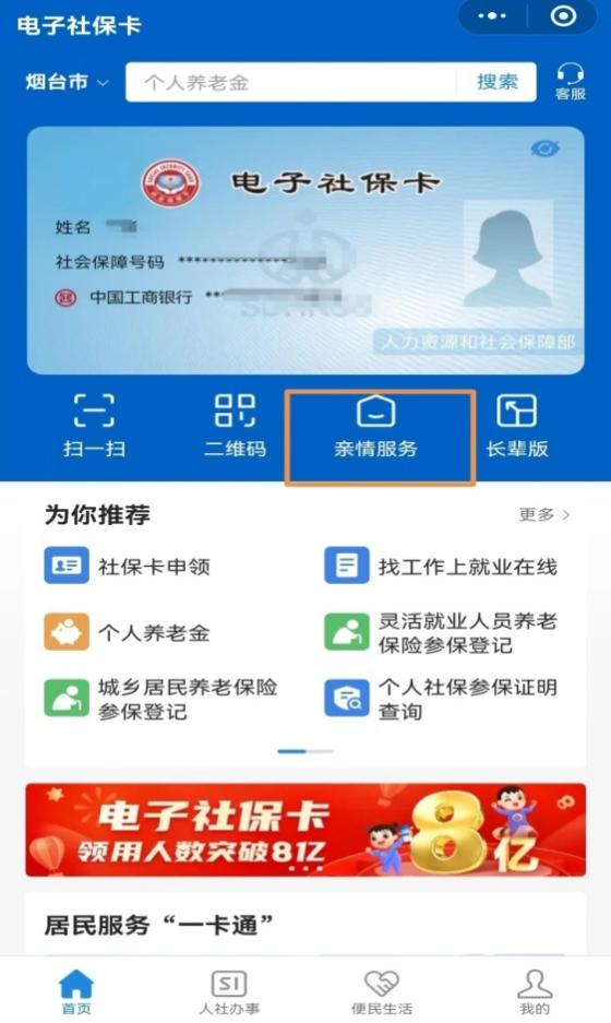 (一)登陆本人已经申领的电子社保卡,在“电子社保卡图片下方”点击“亲情服务”。