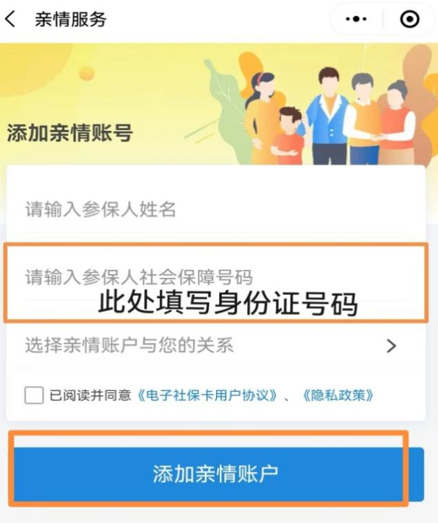 (五)添加亲情账号的参保人姓名、社会保障号码(即身份证号码),并选择亲情账户与您的关系(子女、父母、配偶或其他),然后点击“添加亲情账户”。