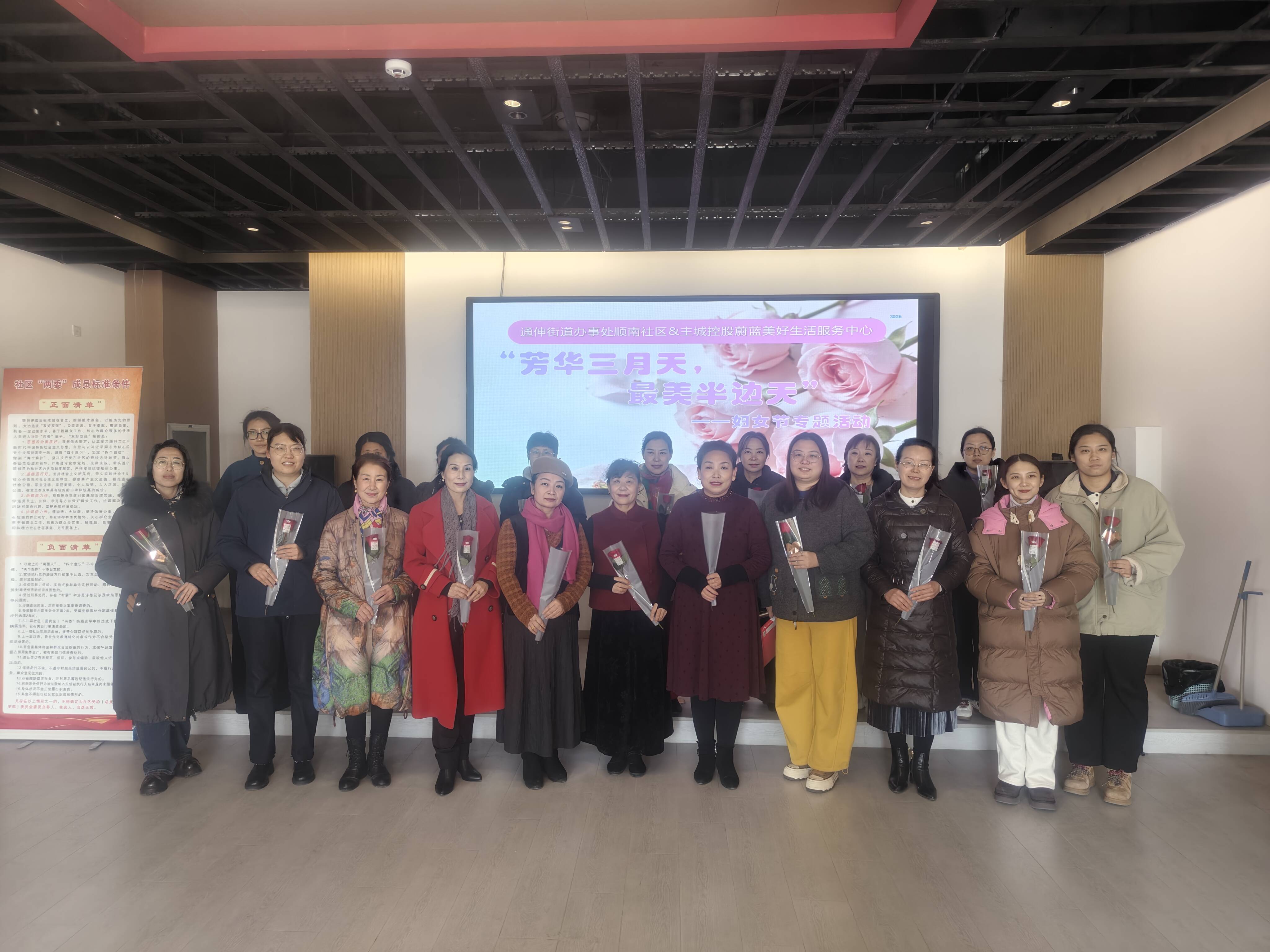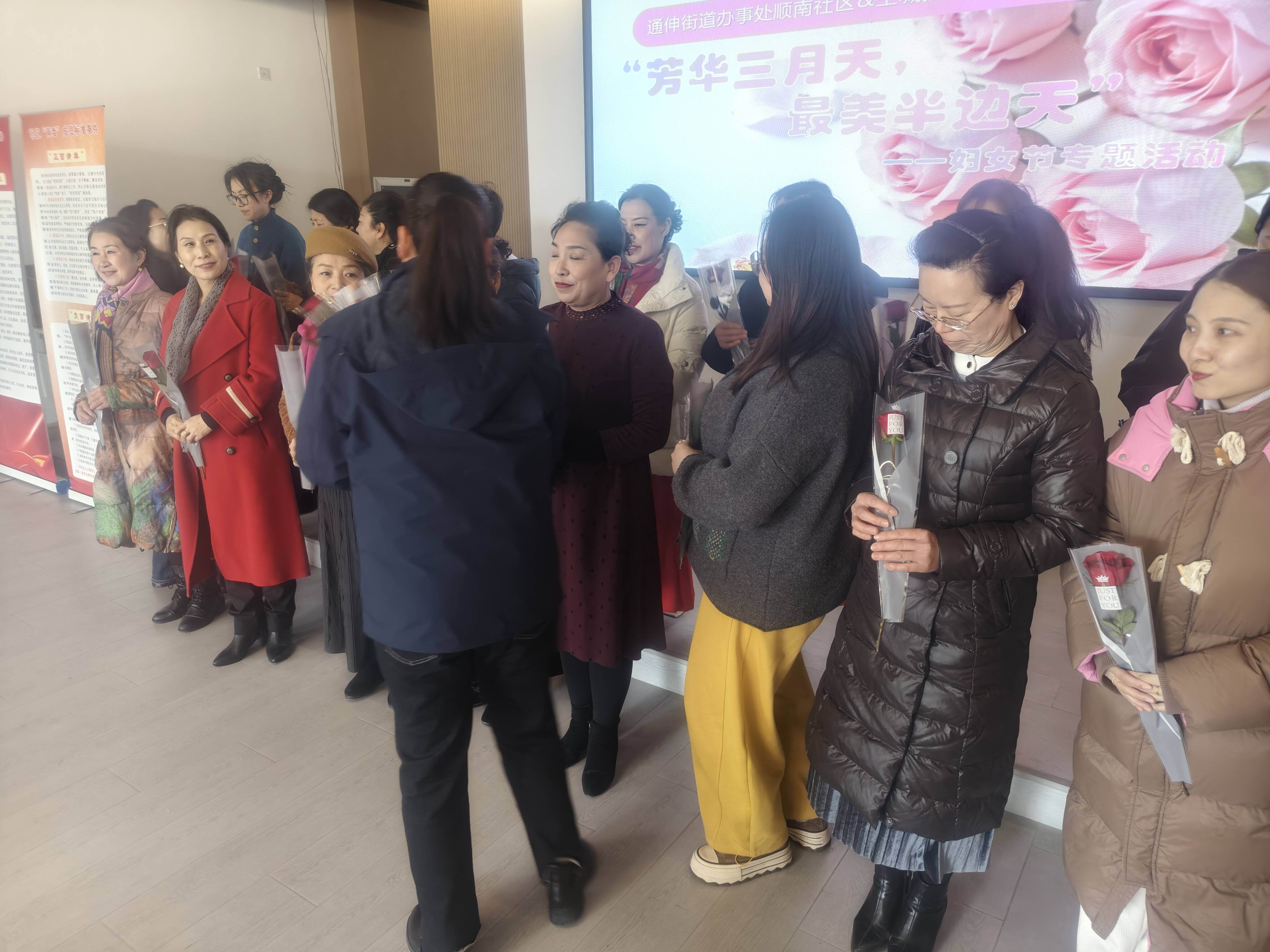 活动在热烈的掌声中拉开帷幕。首先,主城控股蔚蓝美好生活服务中心的工作人员为每位到场的妇女居民献上了精心准备的玫瑰花,象征着对女性的美好祝福。接过鲜花的居民们脸上洋溢着幸福的笑容,现场氛围温馨而浪漫。