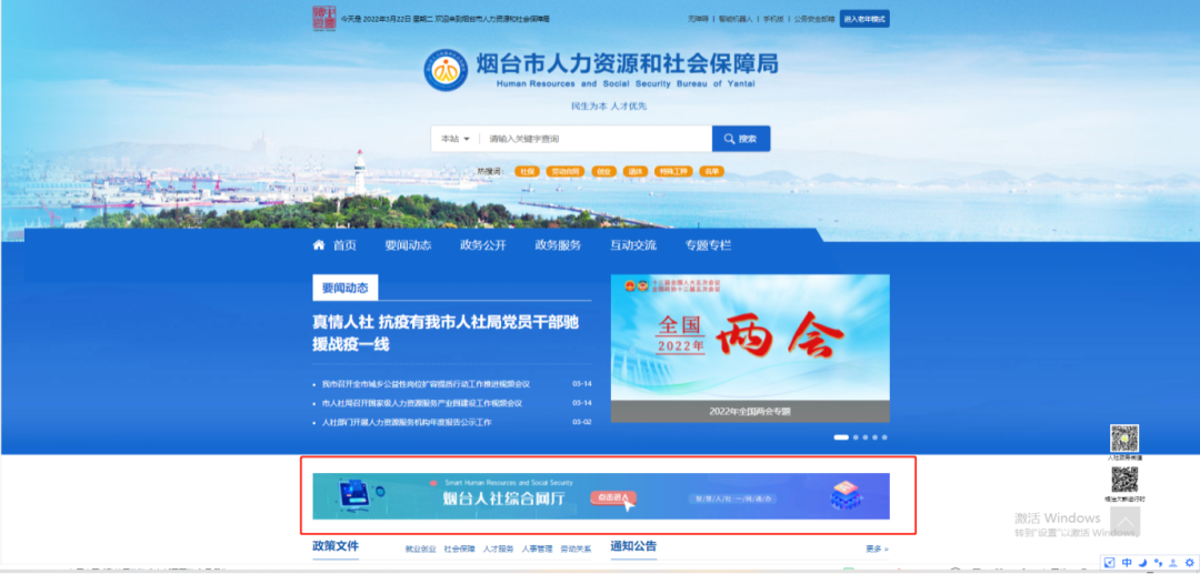 1.通过互联网登录“烟台市人力资源和社会保障局”门户网站(http://rshj.yantai.gov.cn/),在网站中部找到“烟台人社综合网厅”,点击进入。