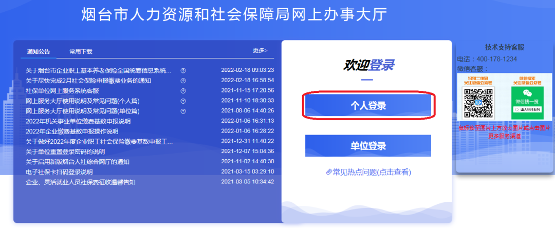 2.官网办理的,选择“个人登录”,输入账号及密码,进入烟台人力资源和社会保障局网上大厅。
